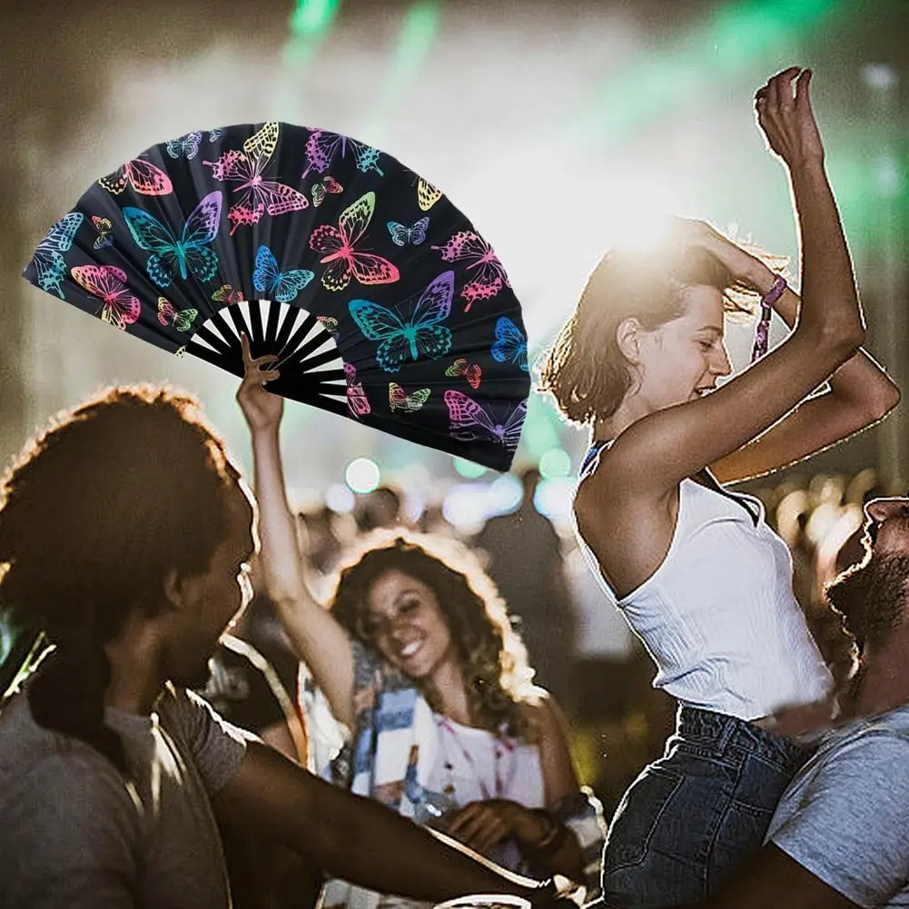 EASY TO USE: foldable portable 13 inch large fan, we use fluorescent ink to make the fan glow beautifully under UV light (party black light) and the color never fades. A quick snap of the wrist turns the fan on, providing the popping sound, and can also be used as a cooling accessory or parasol in hot and humid weather.