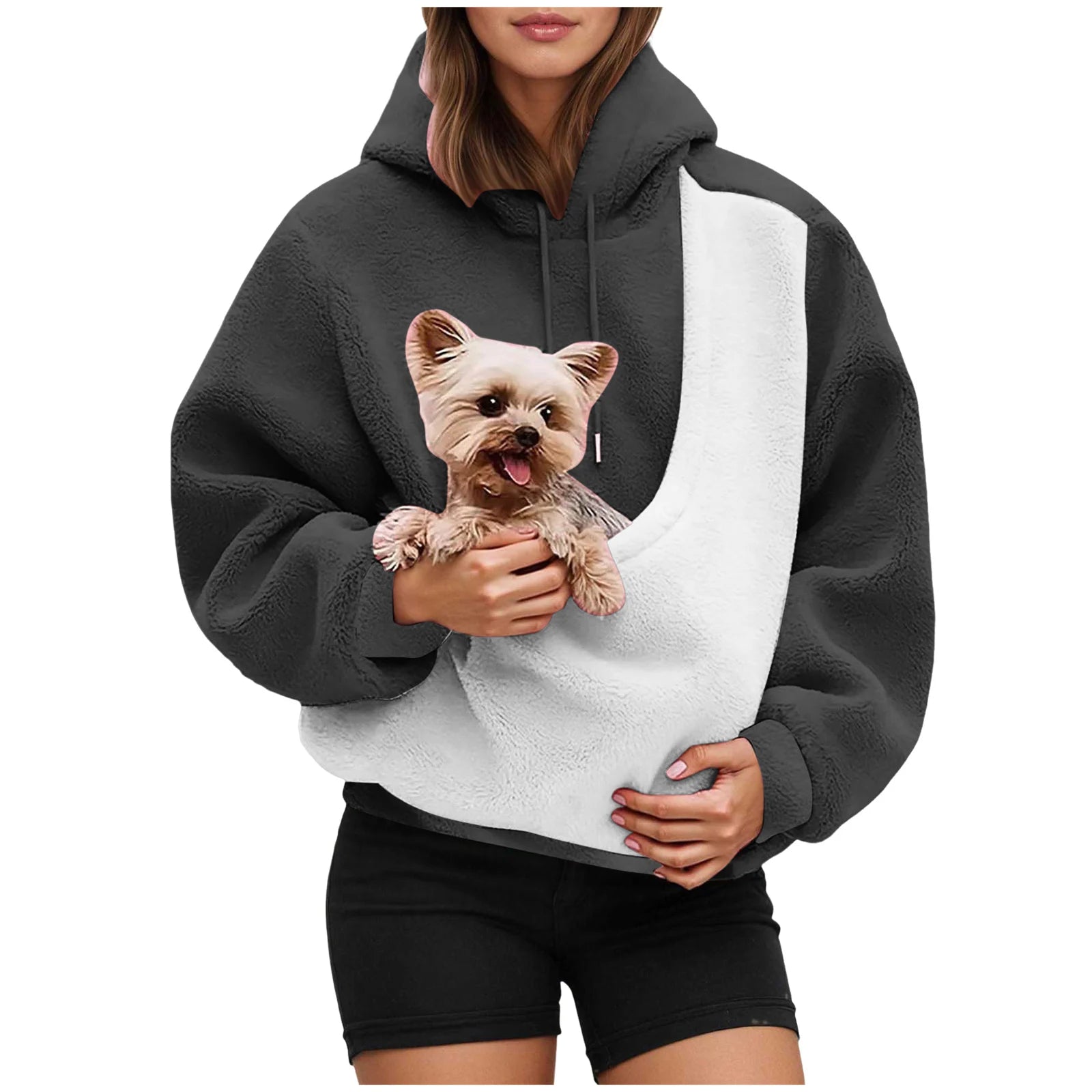 Women Fall And Winter Casual Fleece Solid Color Pet Pocket Hooded Sweatshirt Funny Pullover